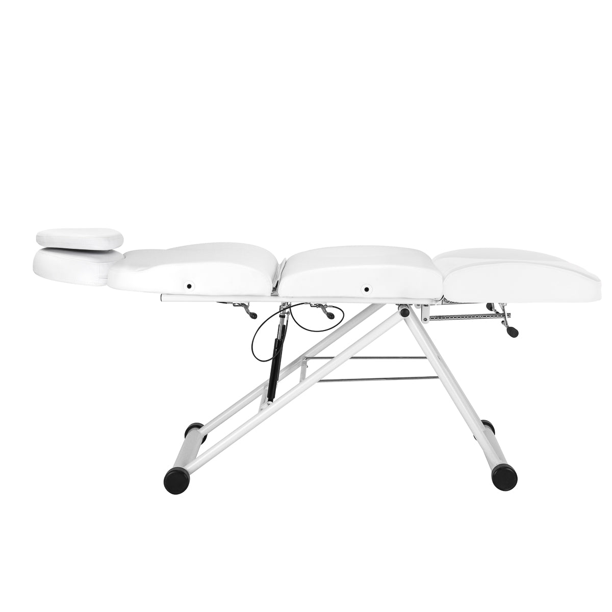 Die Winkel, in denen sich die Fußstütze und die Rückenlehne befinden, werden durch einen speziellen Mechanismus eingestellt. Mit Hilfe von manuellen Hebeln können Sie die Position des Stuhls frei einstellen. Dies ermöglicht eine optimale Anpassung an die individuellen Bedürfnisse, für eine korrekte und komfortable Durchführung der Behandlungen und einen hohen Bedienkomfort. Der Sessel kann in eine Liegeposition zurückgelehnt werden und erreicht eine maximale Länge von über 2 m, was seine Funktionalität erheblich erhöht, und zusammen mit der Öffnung in der Kopfstütze bietet er Freiheit für die Durchführung von Gesichts- und Körperbehandlungen.