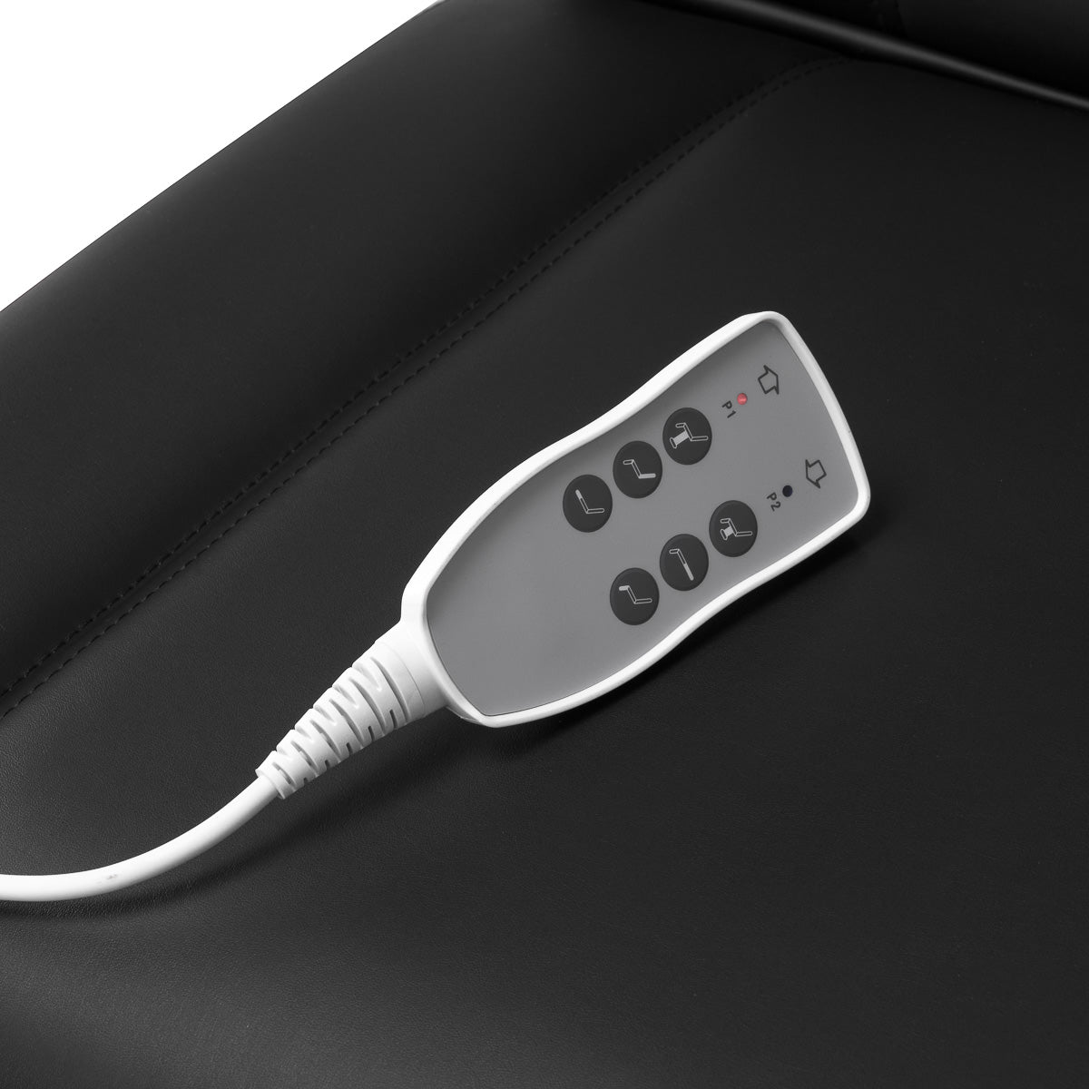 Die bequeme Steuerung mit einer kabelgebundenen Fernbedienung ermöglicht eine präzise Positionierung des Stuhls in vier Ebenen: Höhenverstellung, Rückenlehnenwinkel und Position der Fußstütze. Dieser Einstellbereich ermöglicht es Ihnen, die Position an die Art der durchgeführten Behandlung anzupassen – sowohl im Hinblick auf den Komfort des Kunden als auch auf die Ergonomie der Arbeit des Spezialisten. Zur Vereinfachung der Bedienung kann die Fernbedienung an die Griffe gehängt werden, die sich auf beiden Seiten des Sitzes befinden.