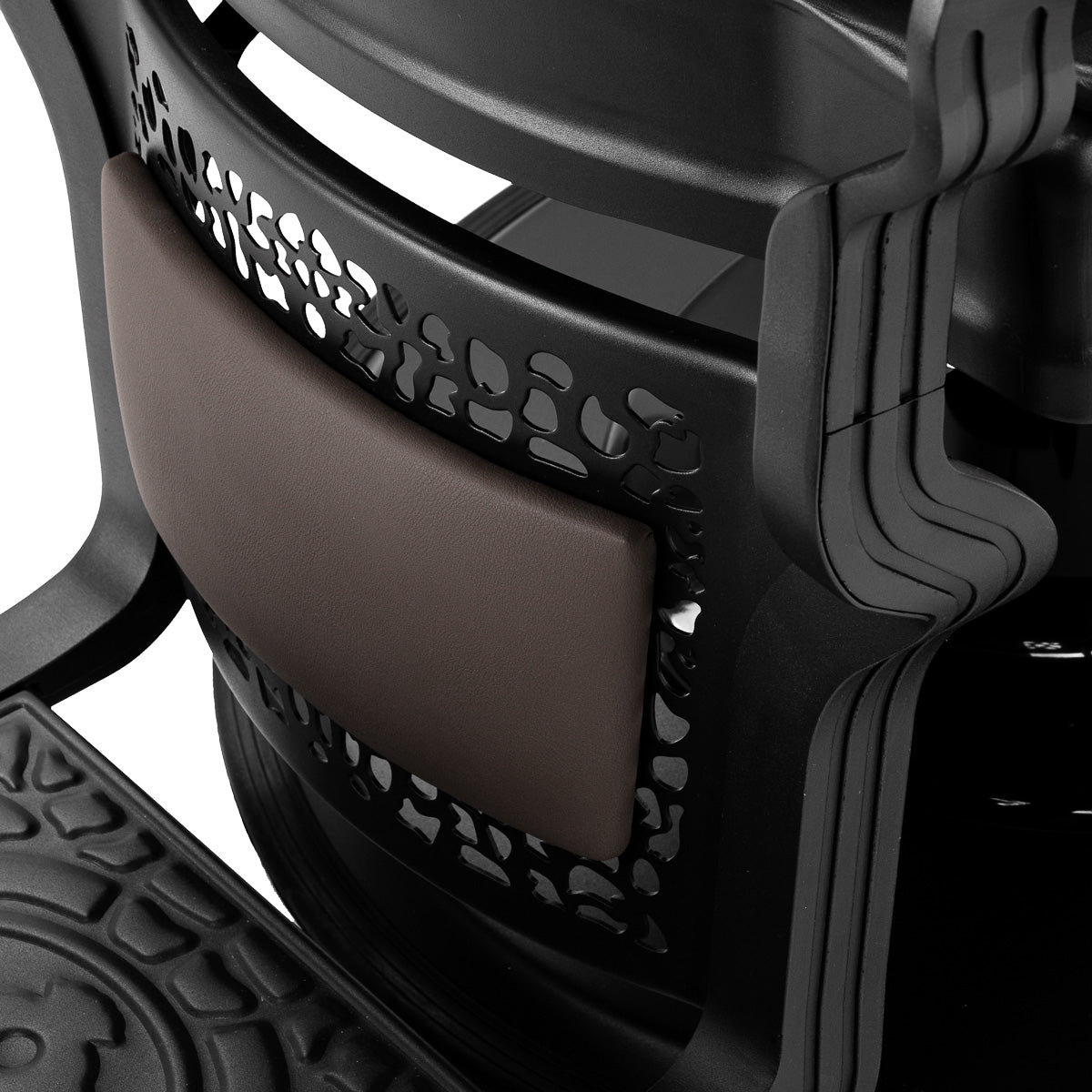 Die solide Konstruktion der Basis sorgt für Stabilität und hohen Nutzungskomfort. Die Sitzfüllung aus strapazierfähigem, verformungsbeständigem Schaumstoff und die Polsterung aus angenehm anzufassendem Kunstleder mit mattem Finish sorgen für eine lange Haltbarkeit des Möbels und einen komfortablen Gebrauch über lange Zeit. Die verwendeten Materialien machen das Gerät zudem feuchtigkeitsbeständig, langlebig und leicht zu reinigen. Der Bezug in Brauntönen sowie der verzierte Fußhocker verleihen ihm einen einzigartigen Charakter. Der Stuhl mit seinem charakteristischen Design, das den Vintage-Stil aufgreift, passt perfekt zur Atmosphäre von Friseursalons und unterstreicht deren einzigartige Atmosphäre.