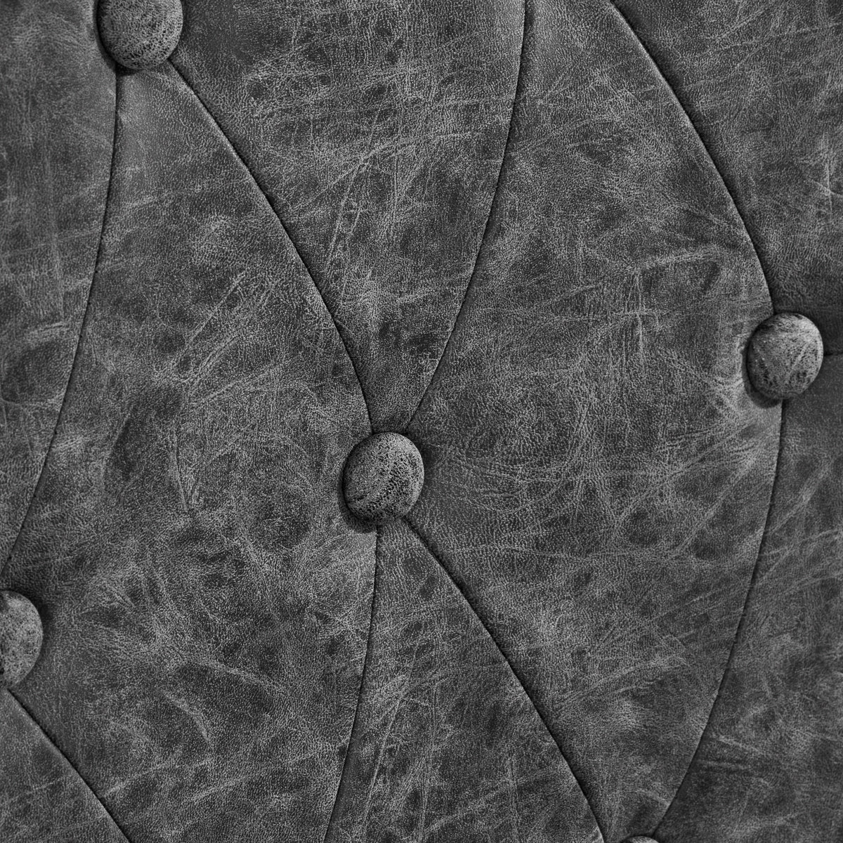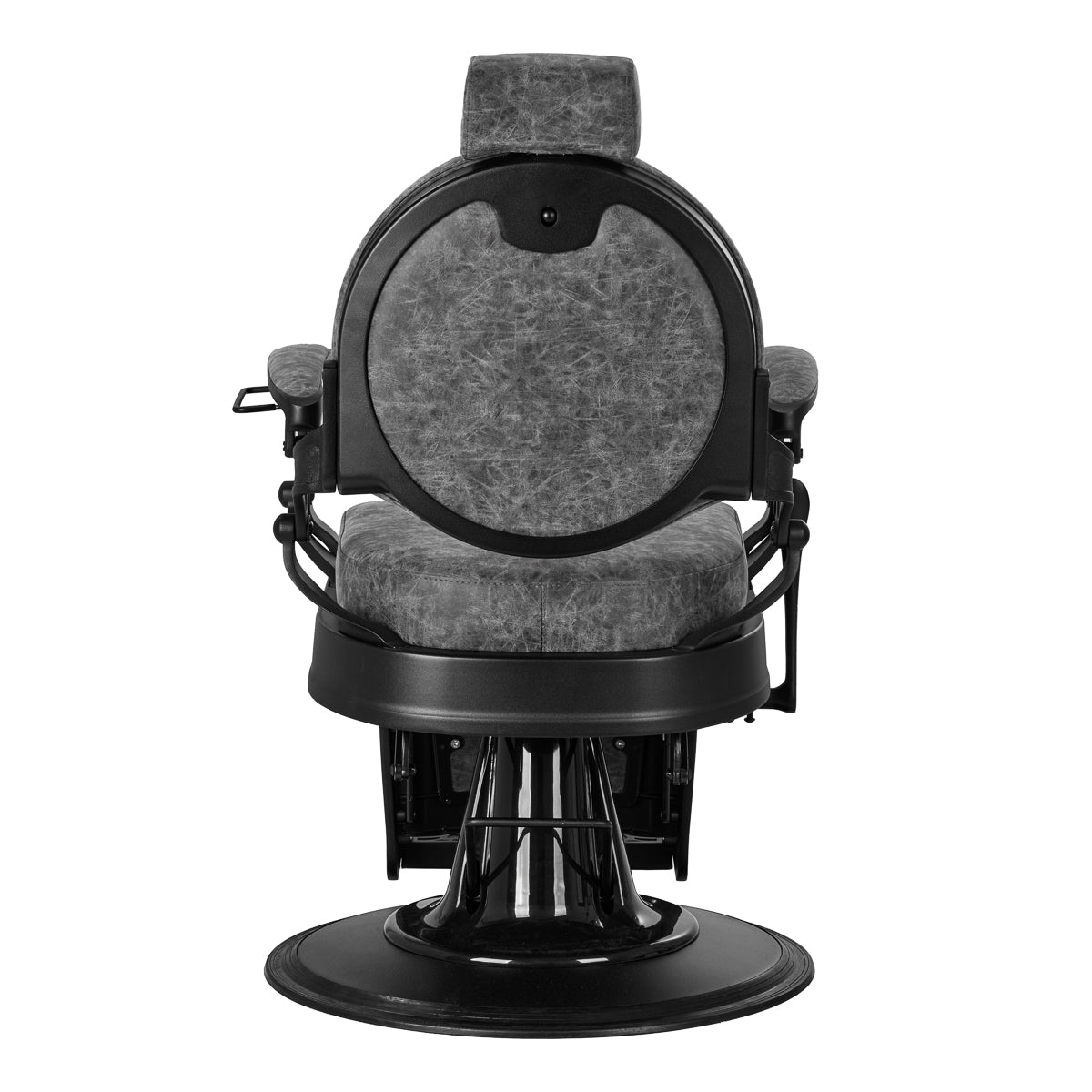 Die solide Konstruktion des Sockels sorgt für Stabilität und hohen Nutzungskomfort. Die Sitzfüllung aus strapazierfähigem, verformungsbeständigem Schaumstoff und die Polsterung aus angenehm haptisch anmutendem Kunstleder mit mattem Finish und gealtertem Effekt sorgen für die Langlebigkeit der Möbel und ihre komfortable Nutzung über einen langen Zeitraum. Außerdem machen sie die Geräte feuchtigkeitsbeständig, langlebig und leicht zu reinigen. Der Bezug in Grautönen mit Steppung und Zierknöpfen verleiht ihm einen einzigartigen Charakter. Der Sessel mit seinem charakteristischen Design, das sich auf den Vintage-Stil bezieht, fügt sich perfekt in die Atmosphäre von Friseursalons ein und unterstreicht deren einzigartige Atmosphäre.