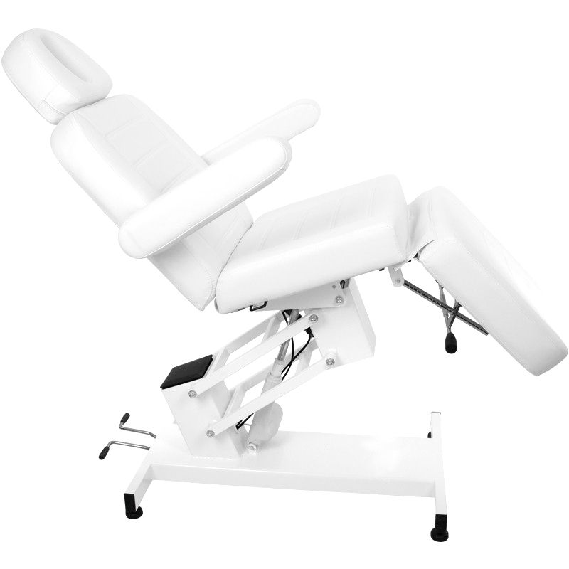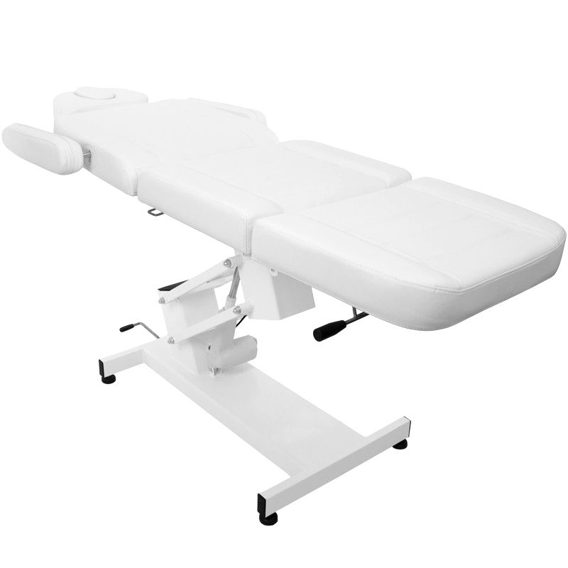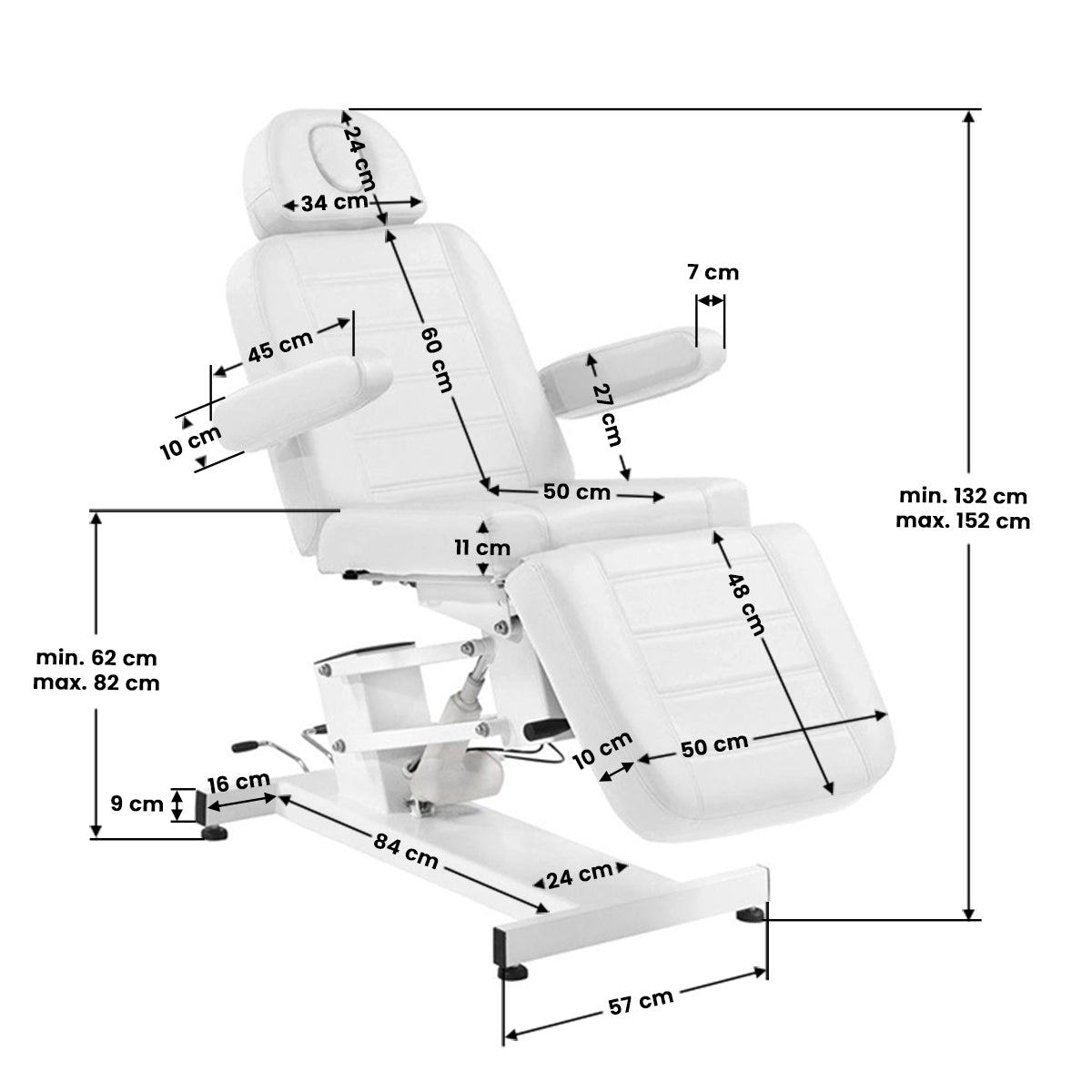 Die Sitzhöhe (oben – unten) der Kosmetikliege kann mit Fernbedienung verstellt werden. Zwei Pedale auf der Rückseite des Kosmetikliegegestelles ermöglichen, eine Rückenlehnen- und Wiegeneigung gewandt zu verstellen. Ein bequemer Kosmetiksessel (bis 180 Grad ausklappbar) kann erfolgreich als Liege verwendet werden. In der Kopfstütze befindet sich ein abdeckbarer Gesichtsausschnitt, der ermöglicht, in einer bequemen Position bei den Behandlungen u. a. bei der Massage zu liegen. Der Sitz ist mit einem hochwertigen und pflegeleichten Ökoleder bedeckt. Die Fußstütze ist manuell verstellbar. Es besteht die Möglichkeit, die Armlehnen nach oben zu heben, was dem Kunden erleichtert, eine Position auf dem Sitz einzunehmen.