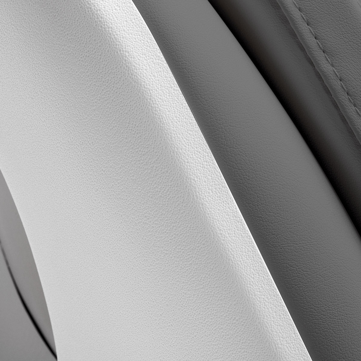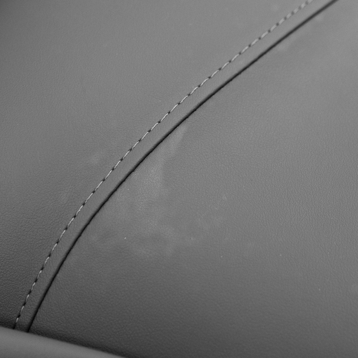 Der Stuhl ist mit Schaumstoff gefüllt und mit einer angenehm zu berührenden, matten Lederimitation in Grautönen bezogen. Dank der Verwendung eines solchen Materials ist das Gerät feuchtigkeitsbeständig und leicht zu reinigen. Gut verarbeitete Säume verleihen ihm einen stilvollen Look. Minimalistisches, schlichtes Design und klassische Farben lassen es in jedes Interieur passen.
