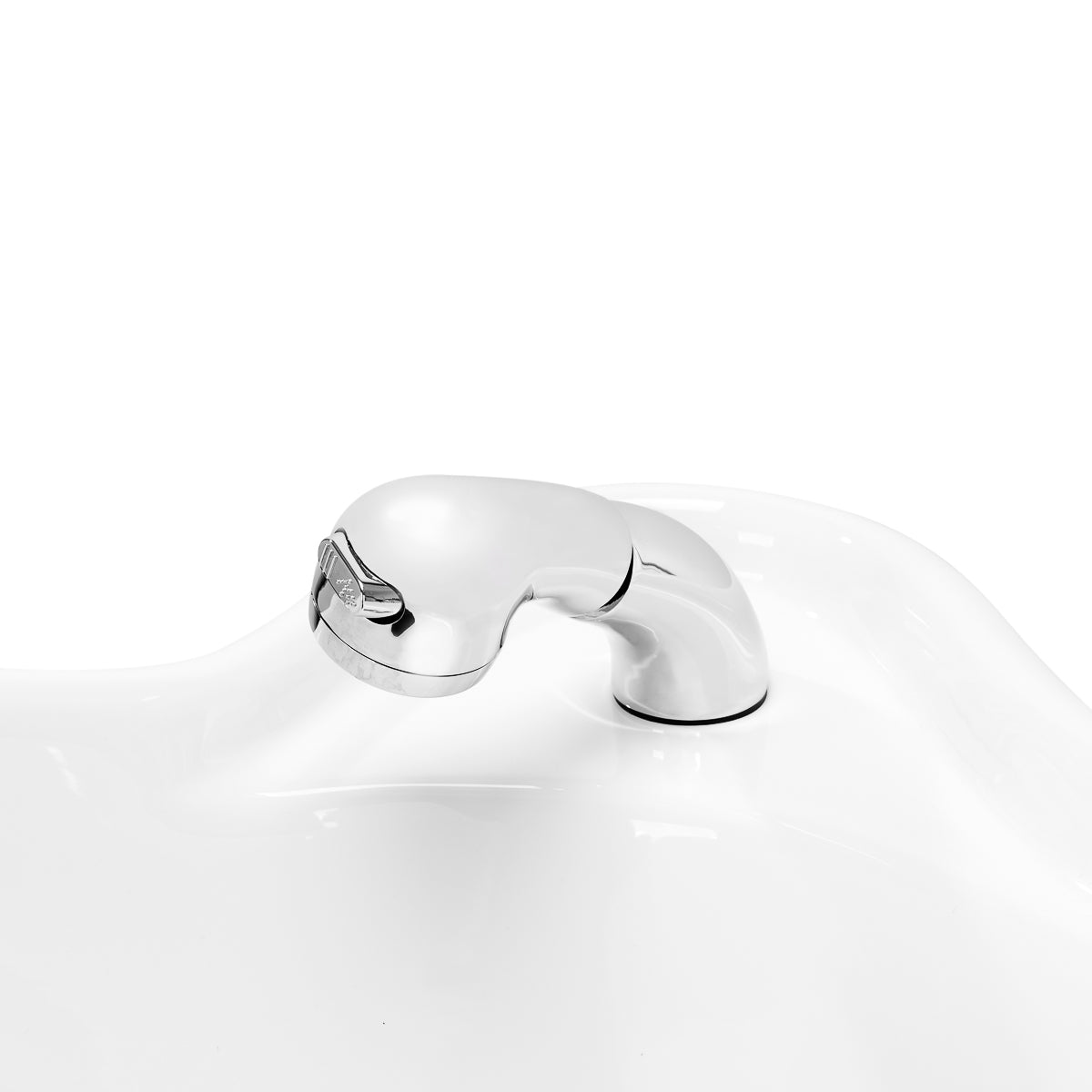Die Tiefe der Keramik-Waschtischschale in Weißtönen ermöglicht eine komfortable und effektive Durchführung einer breiten Palette von Friseurdienstleistungen und verhindert ein übermäßiges Spritzen von Wasser und Produkten, die während der Behandlung verwendet werden. Das verwendete Material macht das Waschbecken langlebig, resistent gegen Verfärbungen und Kratzer und sehr leicht sauber zu halten. Ein richtig profilierter Kragen sorgt für Komfort beim Haarewaschen. Die Verwendung einer speziellen Stütze in der Schale garantiert eine ausreichende Unterstützung des Kopfes, so dass sein Gewicht nicht auf dem Nacken ruht. Die innovative Lösung beugt Verspannungen und Beschwerden im Nackenbereich vor und sorgt für hohen Komfort, auch bei langen Behandlungen. Darüber hinaus spürt der Kunde dank der bequemen Kunststoffauflage in Schwarztönen nicht die Unannehmlichkeiten, die mit der Kälte der Keramikoberfläche verbunden sind.