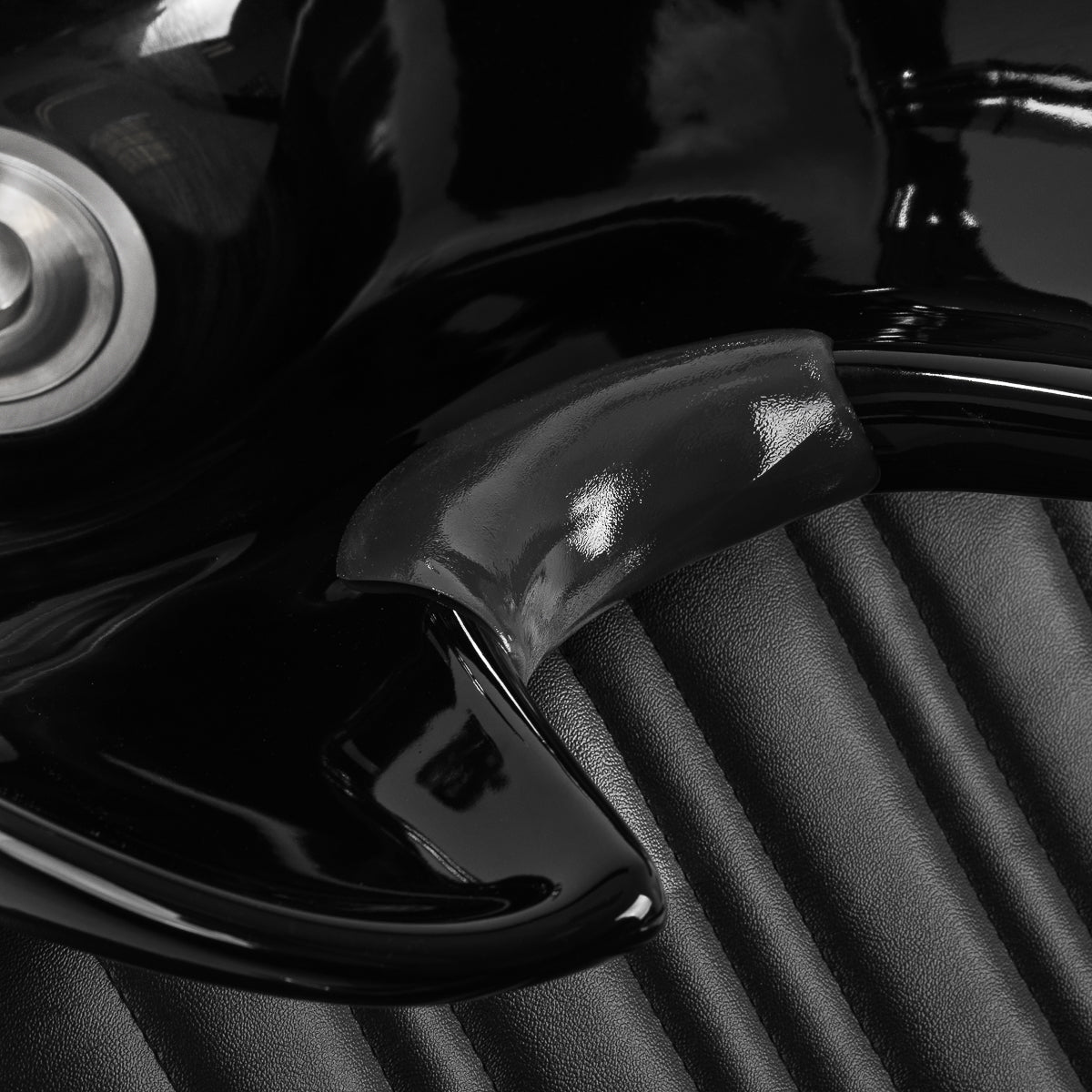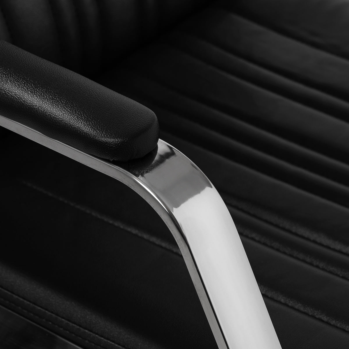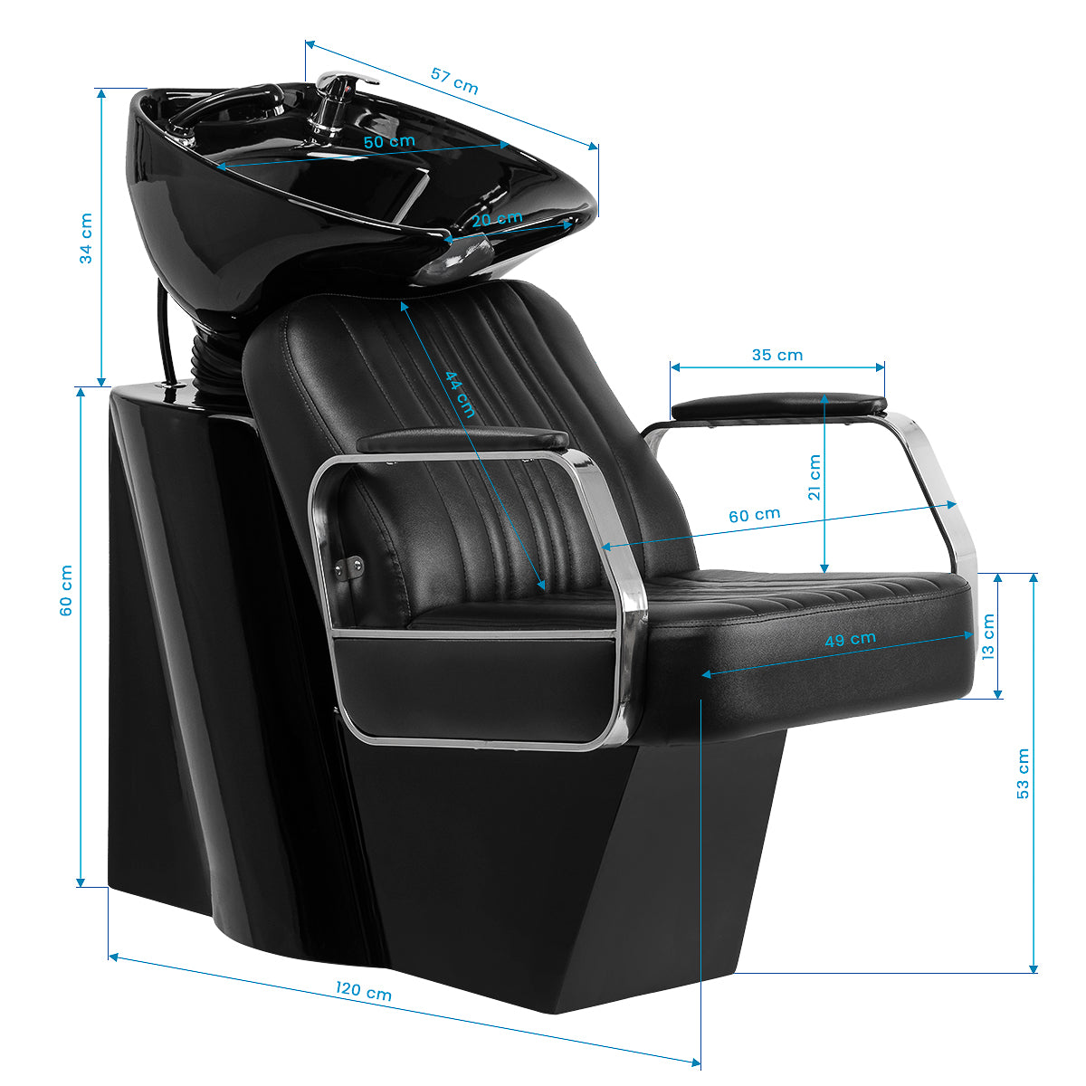 Der konturierte, mit strapazierfähigem Schaumstoff gefüllte Sessel sorgt für einen bequemen Gebrauch, und die gepolsterten Armlehnen erleichtern die korrekte Positionierung der Schultern des Kunden. Die Rückenlehne ist in einem optimalen Winkel platziert, um die Wirbelsäule hervorragend zu stützen. Der Kunstlederbezug in Schwarztönen garantiert eine langjährige Haltbarkeit und einfache Reinigung. Stilvolle Nähte auf den Polstern verleihen der Waschanlage einen vom Automobildesign inspirierten Charakter und unterstreichen ihr beeindruckendes Erscheinungsbild. Eine komplette Halterung in Chrom- und Schwarztönen ist im Lieferumfang enthalten, einschließlich eines Wasserhahns, eines Duschkopfes und spezieller Schläuche, um ein komplettes Set an Werkzeugen für die Arbeit bereitzustellen.