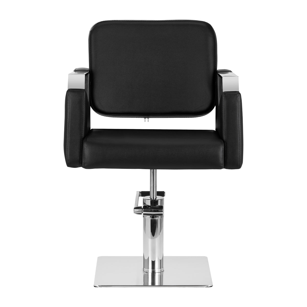 Der stabile, flache, quadratische Sockel garantiert Stabilität während des Gebrauchs. Durch die glatte Oberfläche mit Hochglanz lässt sich das Element leicht sauber halten. Der breite Sitz mit Schaumstofffüllung sorgt für hohen Bedienkomfort und Bequemlichkeit auch bei langen Behandlungsstunden. Die Ausstattung des Stuhls mit einem Volldrehmechanismus macht die Arbeit des Friseurs effektiver und komfortabler. Die Armlehnen befinden sich auf der richtigen Höhe, wodurch sie die korrekte Positionierung der Schultern des Kunden ermöglichen – das bedeutet, dass er seinen Kopf nicht in den Schultern versteckt oder gekrümmt ist – was präzise Behandlungen, einschließlich Haarschnitte, deutlich erleichtert.