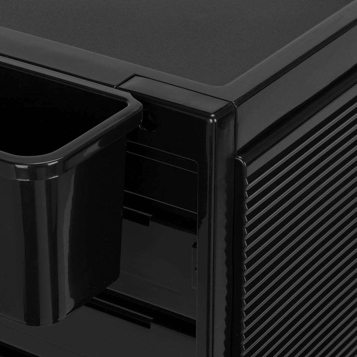 Der geräumige Organizer ist mit einer Reihe von Schubladen ausgestattet, die dazu beitragen, für Ordnung am Arbeitsplatz zu sorgen und die notwendigen Werkzeuge bei der Arbeit des Friseurs zu trennen. Das Set enthält sechs Behälter: zwei ohne Fächer, zwei mit Fächern und zwei schmale und tiefere. Ihr Layout im Organizer kann frei geändert werden, um es an Ihre Bedürfnisse anzupassen, und eine große Auswahl an verschiedenen Arten von Schubladen ermöglicht es Ihnen, die Utensilien nach Belieben zu sortieren. Darüber hinaus können die beiden tiefsten Küvetten in unterschiedlichen Höhen an den Seiten des Helfers platziert werden, sodass sich die darin angeordneten Utensilien immer auf der richtigen Höhe befinden. Die eingebaute Rückseite schützt die Schubladen vor versehentlichem Verrutschen in die andere Richtung, was zu Schäden an den darin befindlichen Utensilien führen könnte.