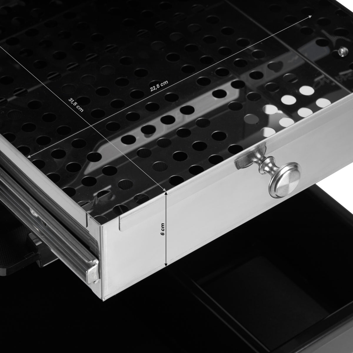Der geräumige Organizer ist mit einer Reihe von Schubladen ausgestattet, die dazu beitragen, für Ordnung am Arbeitsplatz zu sorgen und die notwendigen Werkzeuge bei der Arbeit des Friseurs zu trennen. Das Set enthält sechs Behälter: zwei ohne Fächer, zwei mit Fächern und zwei schmale und tiefere. Ihr Layout im Organizer kann frei geändert werden, um es an Ihre Bedürfnisse anzupassen, und eine große Auswahl an verschiedenen Arten von Schubladen ermöglicht es Ihnen, die Utensilien nach Belieben zu sortieren. Darüber hinaus können die beiden tiefsten Küvetten in unterschiedlichen Höhen an den Seiten des Helfers platziert werden, sodass sich die darin angeordneten Utensilien immer auf der richtigen Höhe befinden. Die eingebaute Rückseite schützt die Schubladen vor versehentlichem Verrutschen in die andere Richtung, was zu Schäden an den darin befindlichen Utensilien führen könnte.