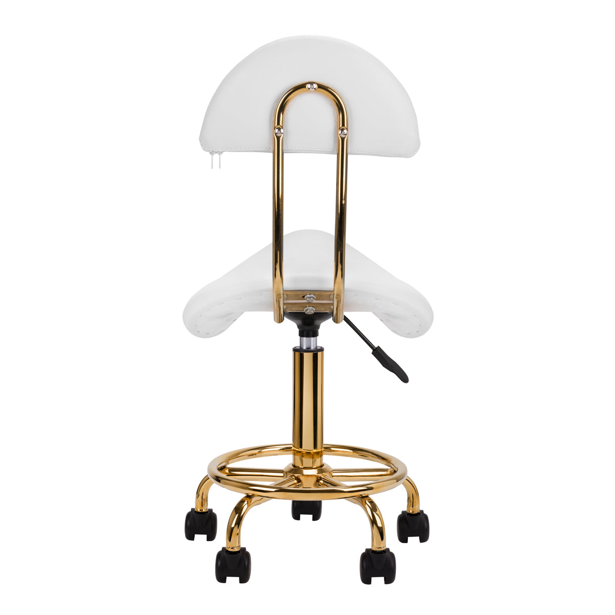 Bequemer, stabiler Kosmetikhocker mit Rückenlehne, mit profiliertem Sitz, Metallelementen in Goldfarbe. Auf einem Fünf-Speichen-Sockel mit Kunststoffrädern. Erhältlich in Weiß, ein unverzichtbares Möbelstück im Schönheitssalon.