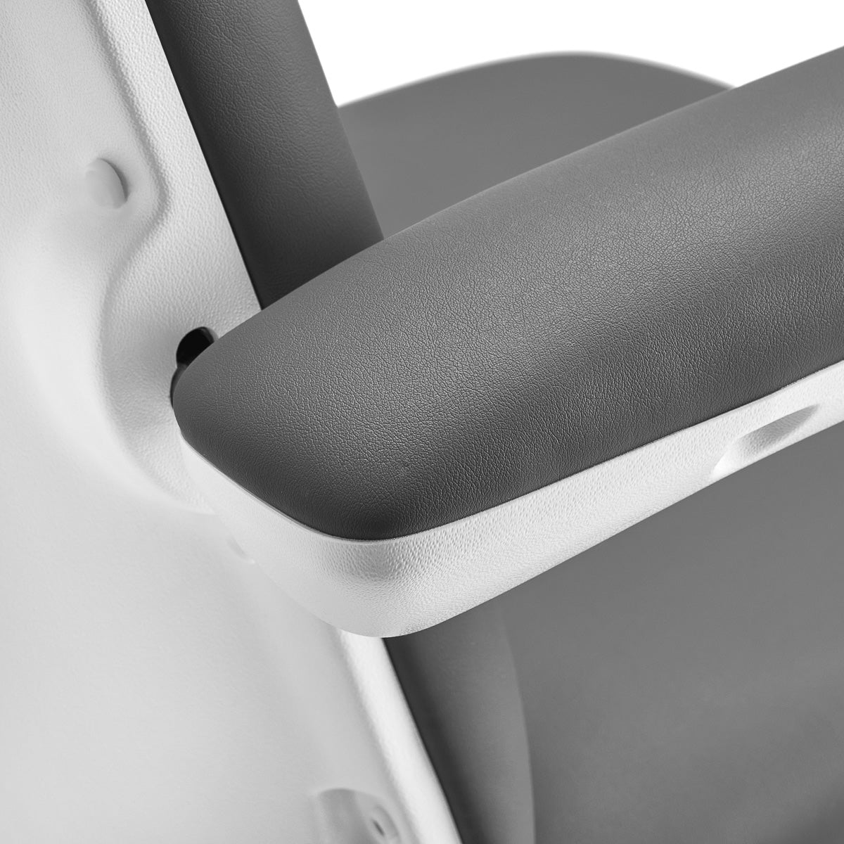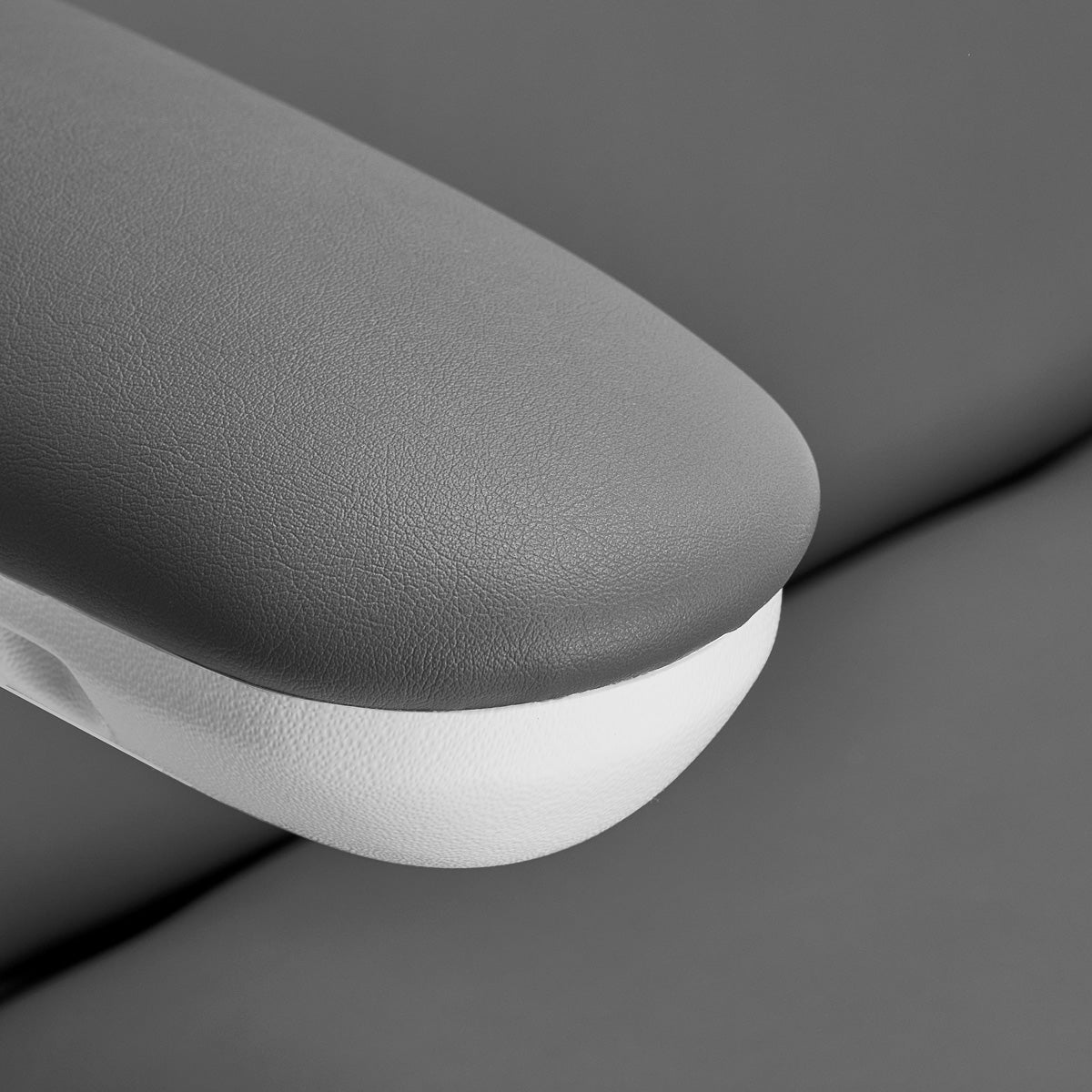 Die Kopfstütze ist ausziehbar, was dazu beiträgt, die Ausrüstung an die Bedürfnisse von Benutzern unterschiedlicher Körpergröße anzupassen und während der Behandlungen eine stabile Kopfstütze zu bieten. 180º bewegliche Armlehnen erleichtern das Sitzen und bieten einen bequemen Zugang für die Person, die den Eingriff durchführt. Die angewandten Lösungen beeinflussen maßgeblich den hohen Bedienkomfort und die Ergonomie der Arbeit.