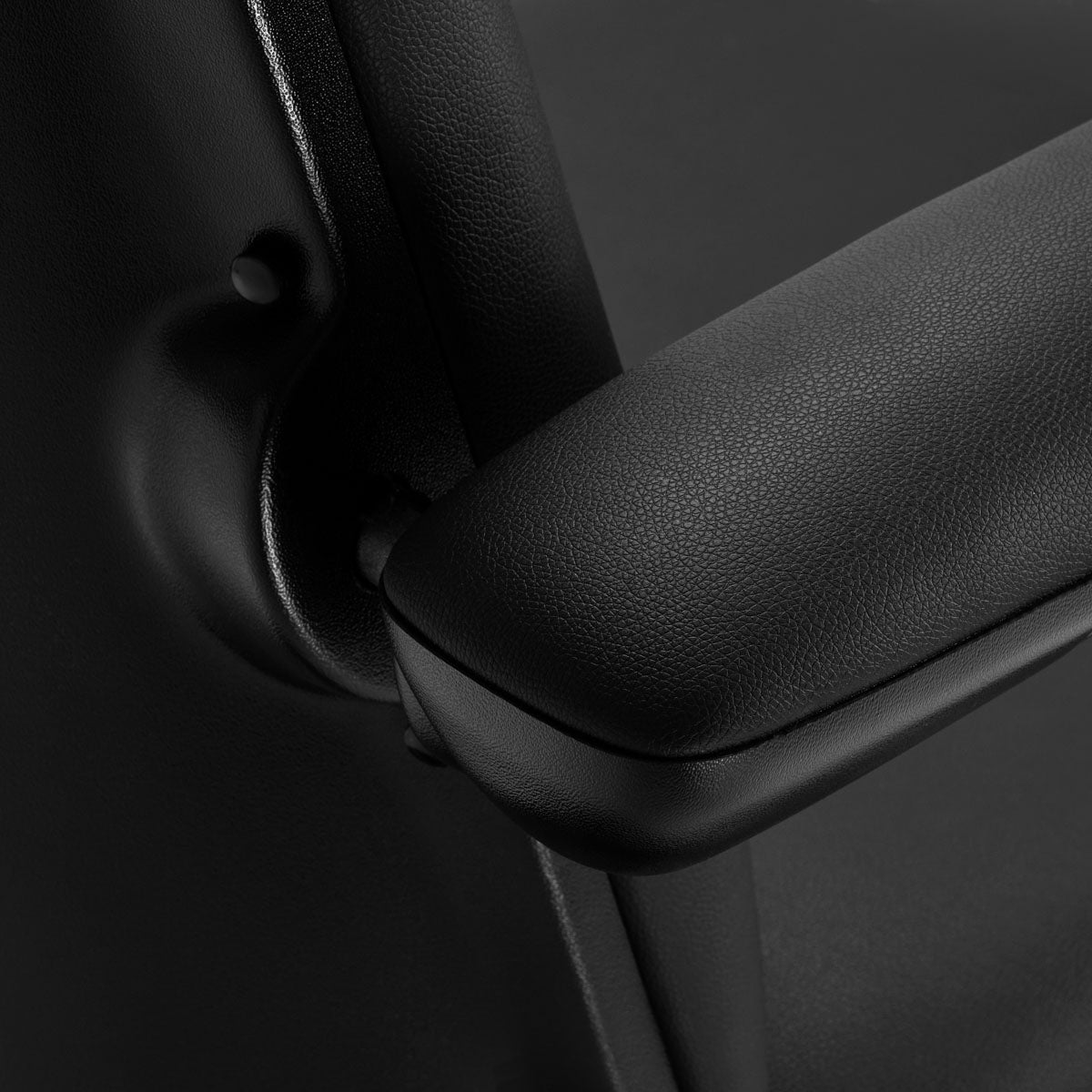 Die solide Basis sorgt für Stabilität, Haltbarkeit des Produkts und Arbeitskomfort. Der Stuhl ist mit Schaumstoff gefüllt und mit einer angenehm zu berührenden, matten Lederimitation in Schwarztönen bezogen. Dank der Verwendung eines solchen Materials ist das Gerät feuchtigkeitsbeständig und leicht zu reinigen. Die stromlinienförmige Form und die Einfachheit des Finishs lassen es sehr ästhetisch aussehen und passen in fast jedes Interieur.