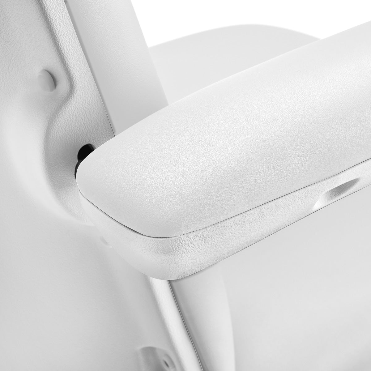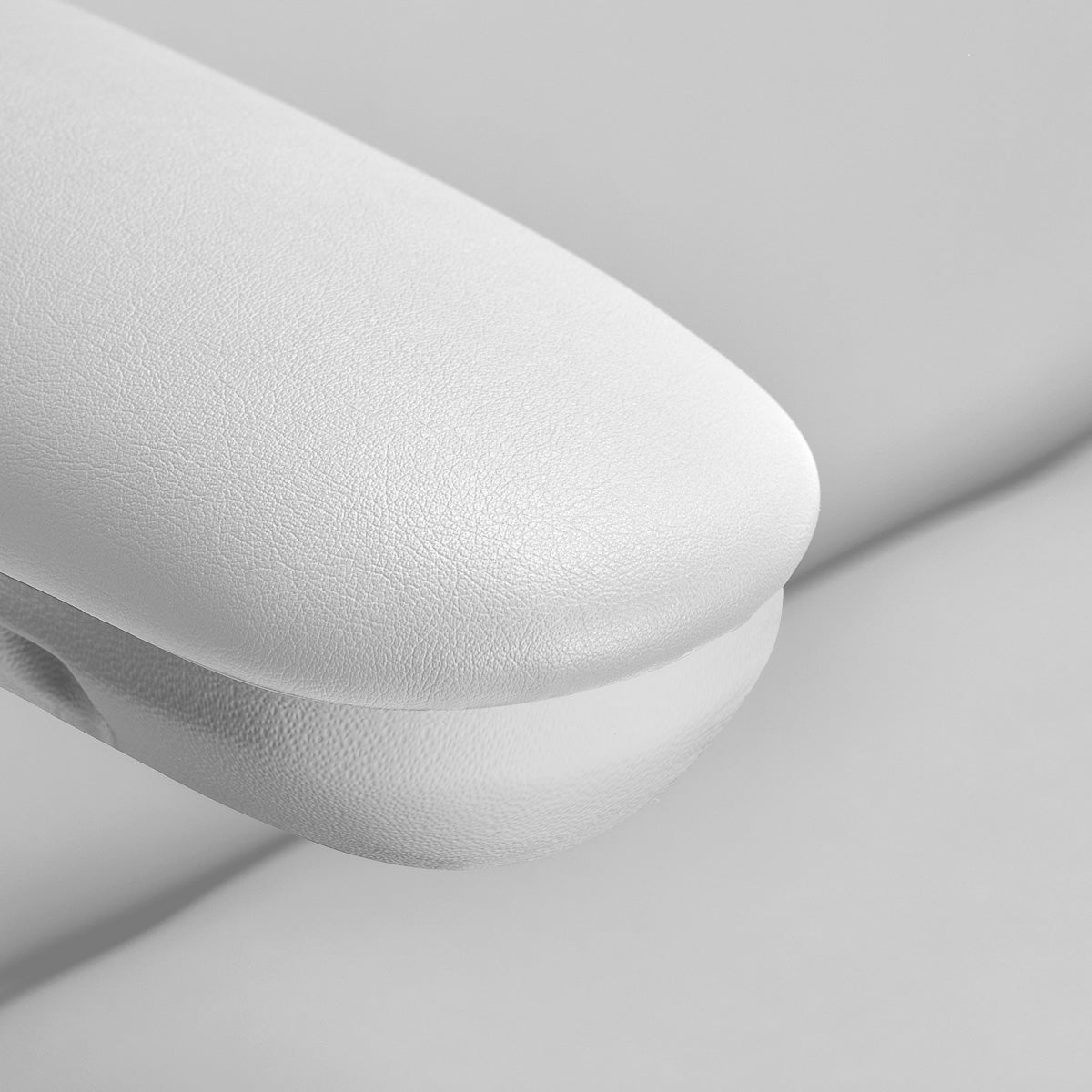 Die Kopfstütze ist ausziehbar, was dazu beiträgt, die Ausrüstung an die Bedürfnisse von Benutzern unterschiedlicher Körpergröße anzupassen und während der Behandlungen eine stabile Kopfstütze zu bieten. 180º bewegliche Armlehnen erleichtern das Sitzen und bieten einen bequemen Zugang für die Person, die den Eingriff durchführt. Die angewandten Lösungen beeinflussen maßgeblich den hohen Bedienkomfort und die Ergonomie der Arbeit.