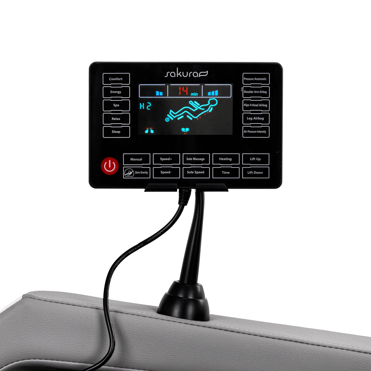 Die Möbel sind mit einem gut lesbaren Bedienfeld mit LCD-Bildschirm ausgestattet, das auf einen an der rechten Armlehne montierten Griff gelegt oder in den Händen gehalten werden kann. Dies macht die Bedienung des Stuhls intuitiv und komfortabel. Der LCD-Bildschirm zeigt Informationen über den aktuellen Betrieb des Geräts an, einschließlich des massierten Körperbereichs, der Intensität der Massage, der Dauer der Behandlung und des ausgewählten Programms. Über das Panel können Sie die Stuhleinstellungen und die Wahl des Massagemodus frei einstellen. Außerdem können Sie die Dauer Ihrer Sitzung mit Optionen von 5, 10, 15, 20, 25 oder 30 Minuten anpassen.